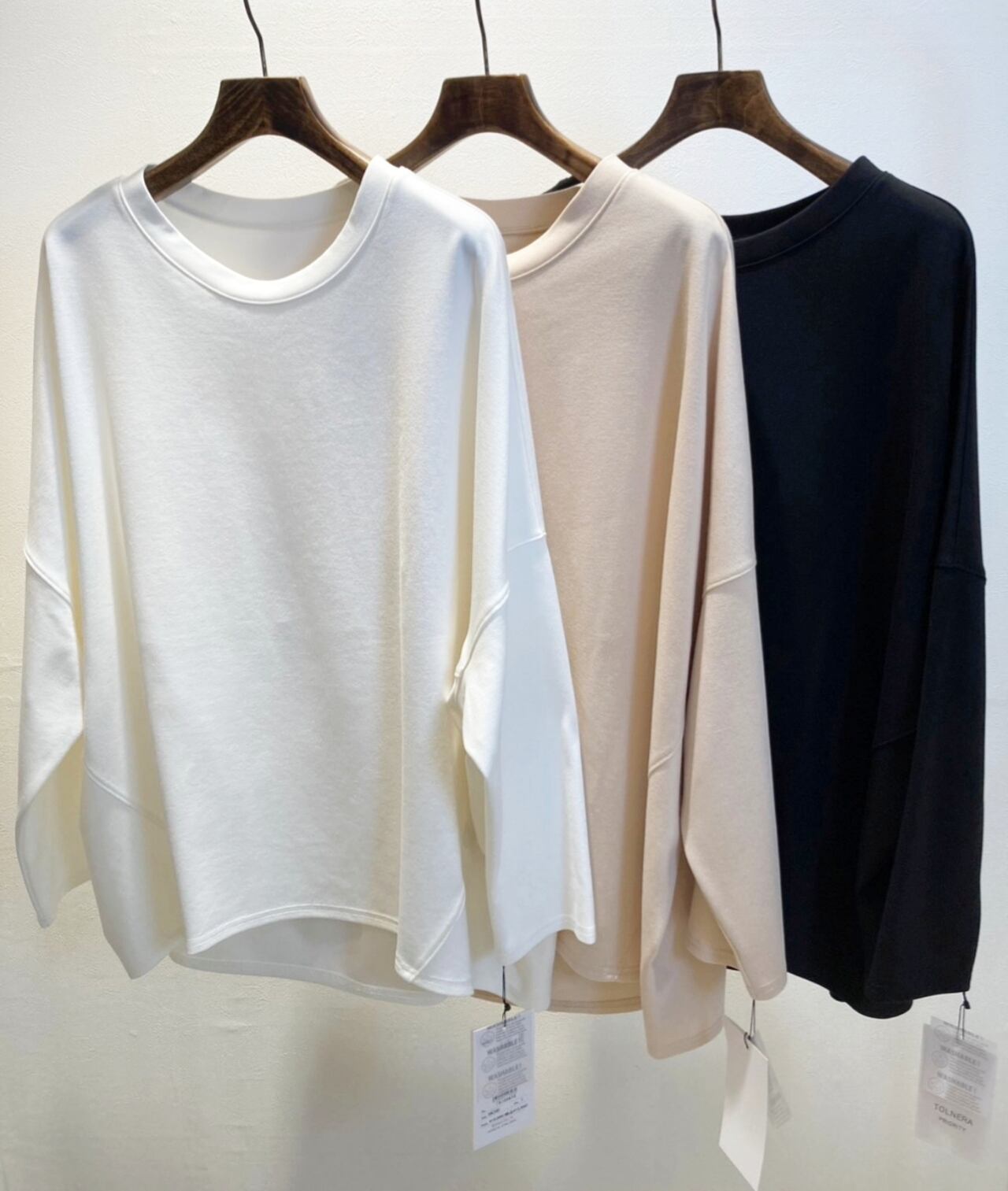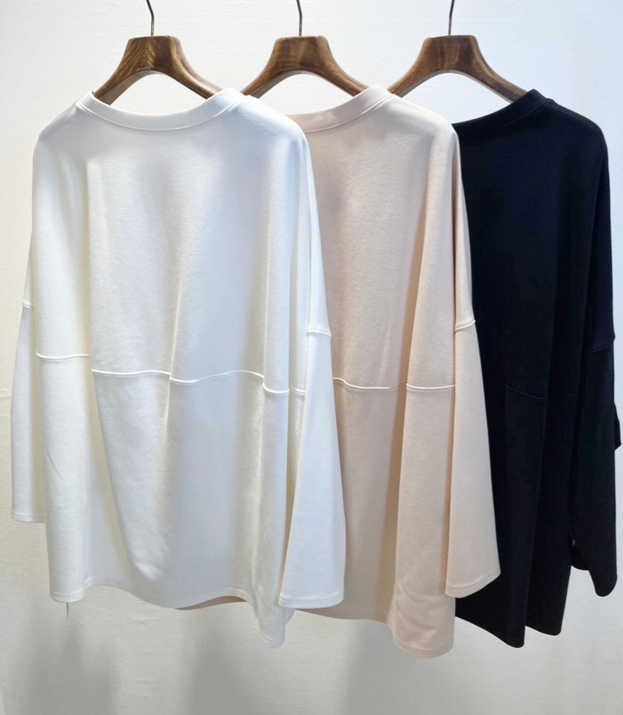 オーバーサイズのデザインながら落ち感がありスッキリ女っぽく見せてくれるシンプルトップス。