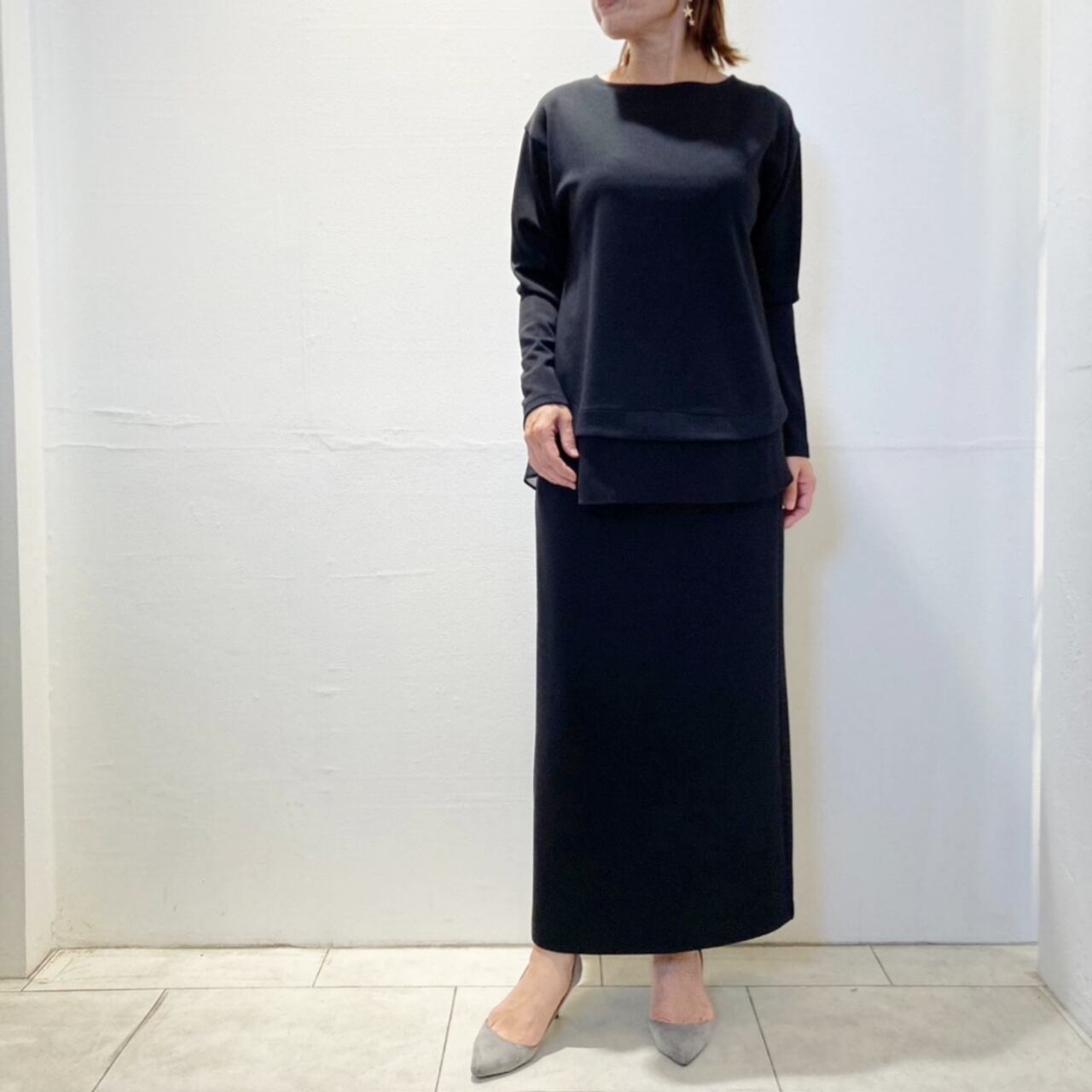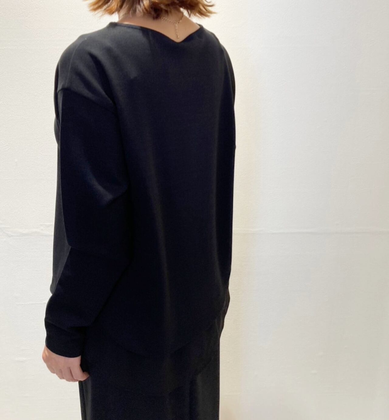 ソフトボンディング素材でトロンと落ち感のある綺麗見えするデザイントップス。
