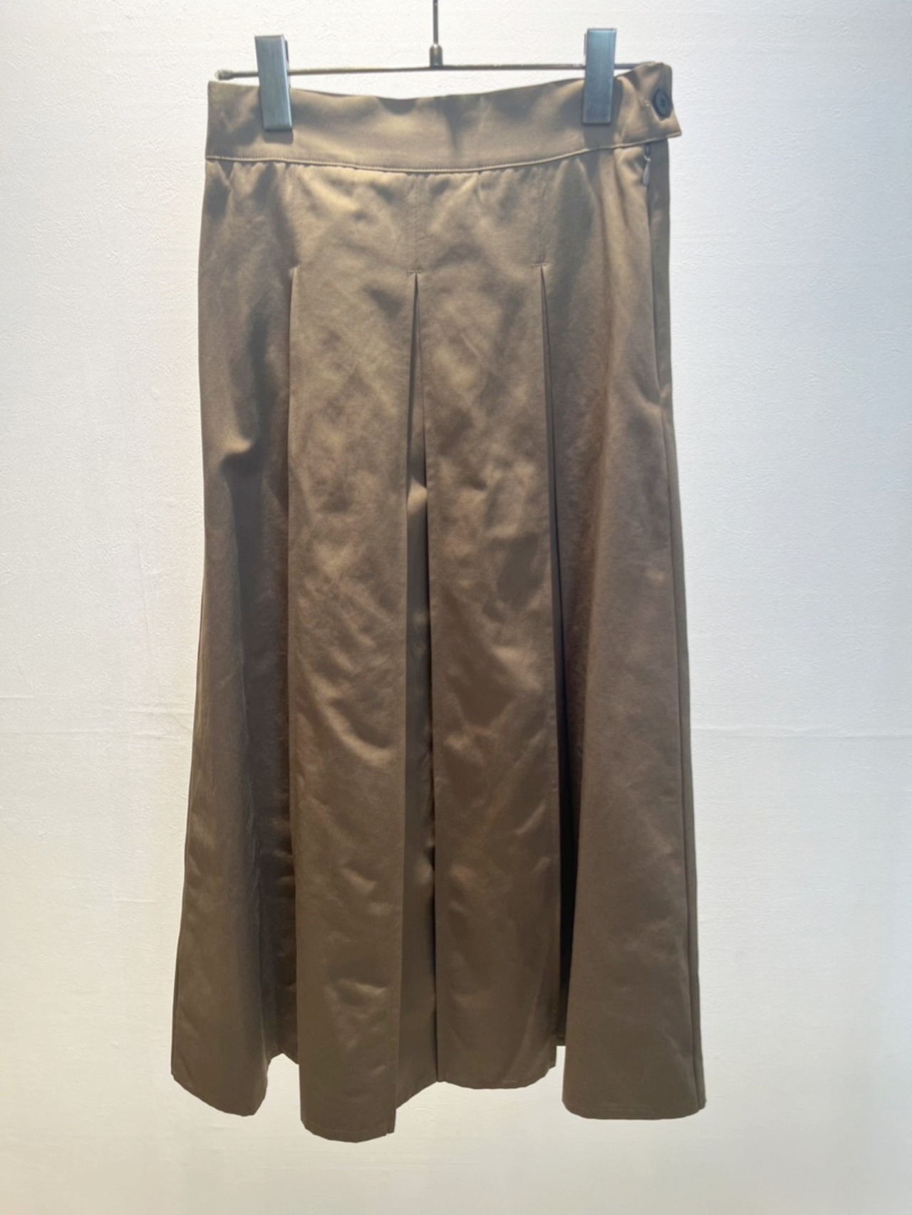 フロントのみがボックスプリーツデザイン、後ろはフレアスカート風で型崩れの心配もなく上品に履いて頂けます。