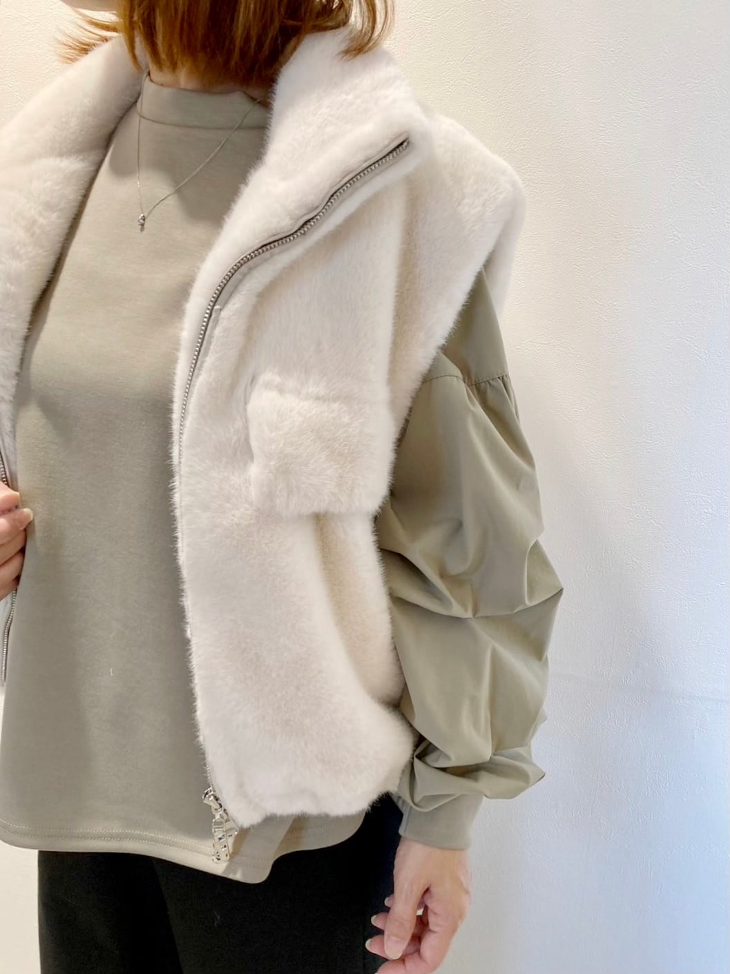エコファーの柔らかな肌触りと程良いボリューミー感、裏地付で暖かくカッコ良くも可愛くも着回して頂ける1着です。