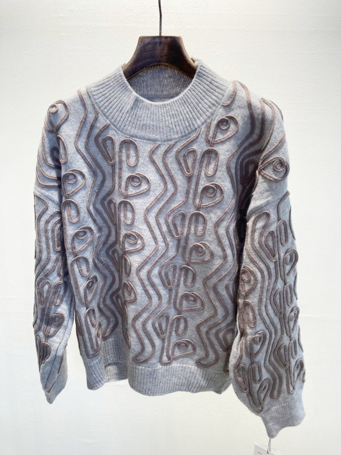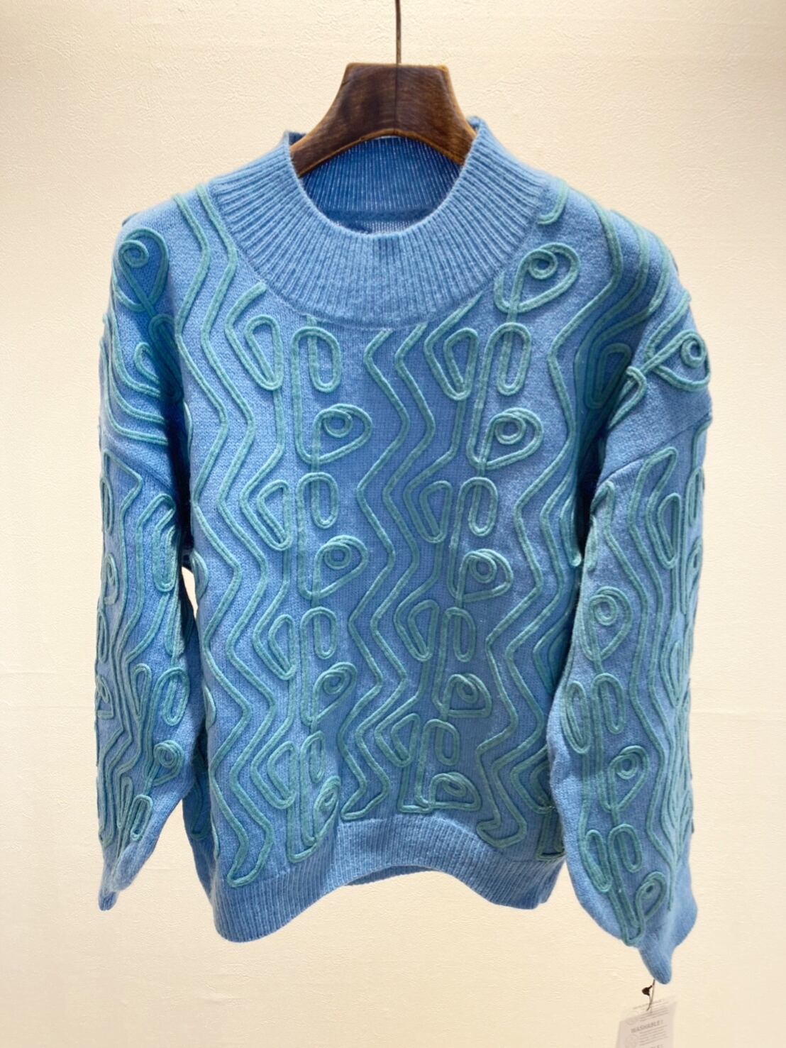 パッと目を惹く配色デザインがオシャレなデザインニットトップスです。