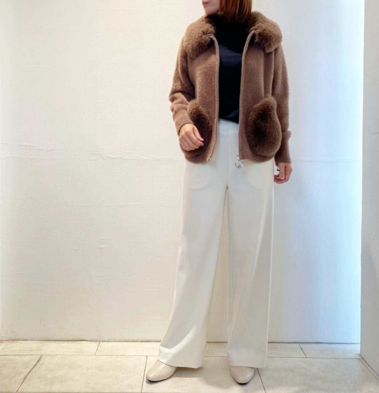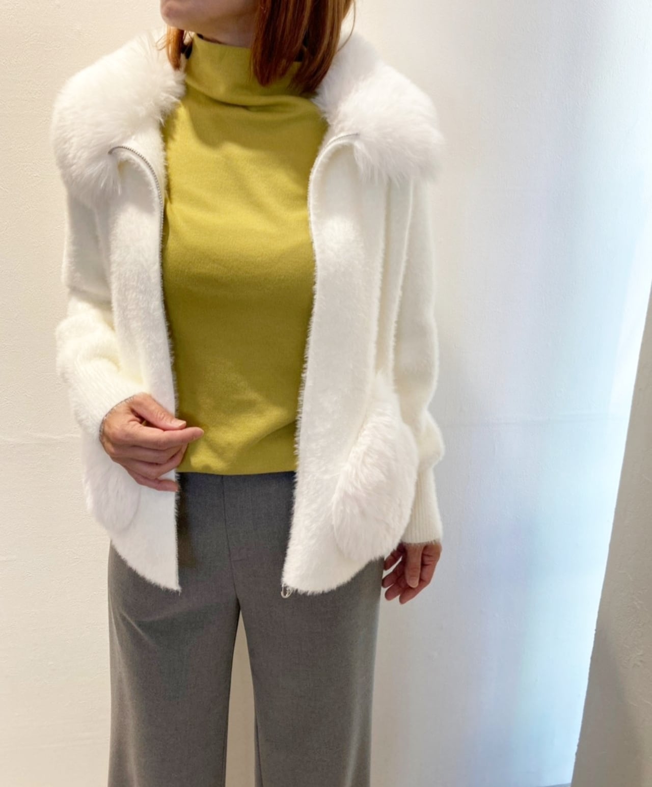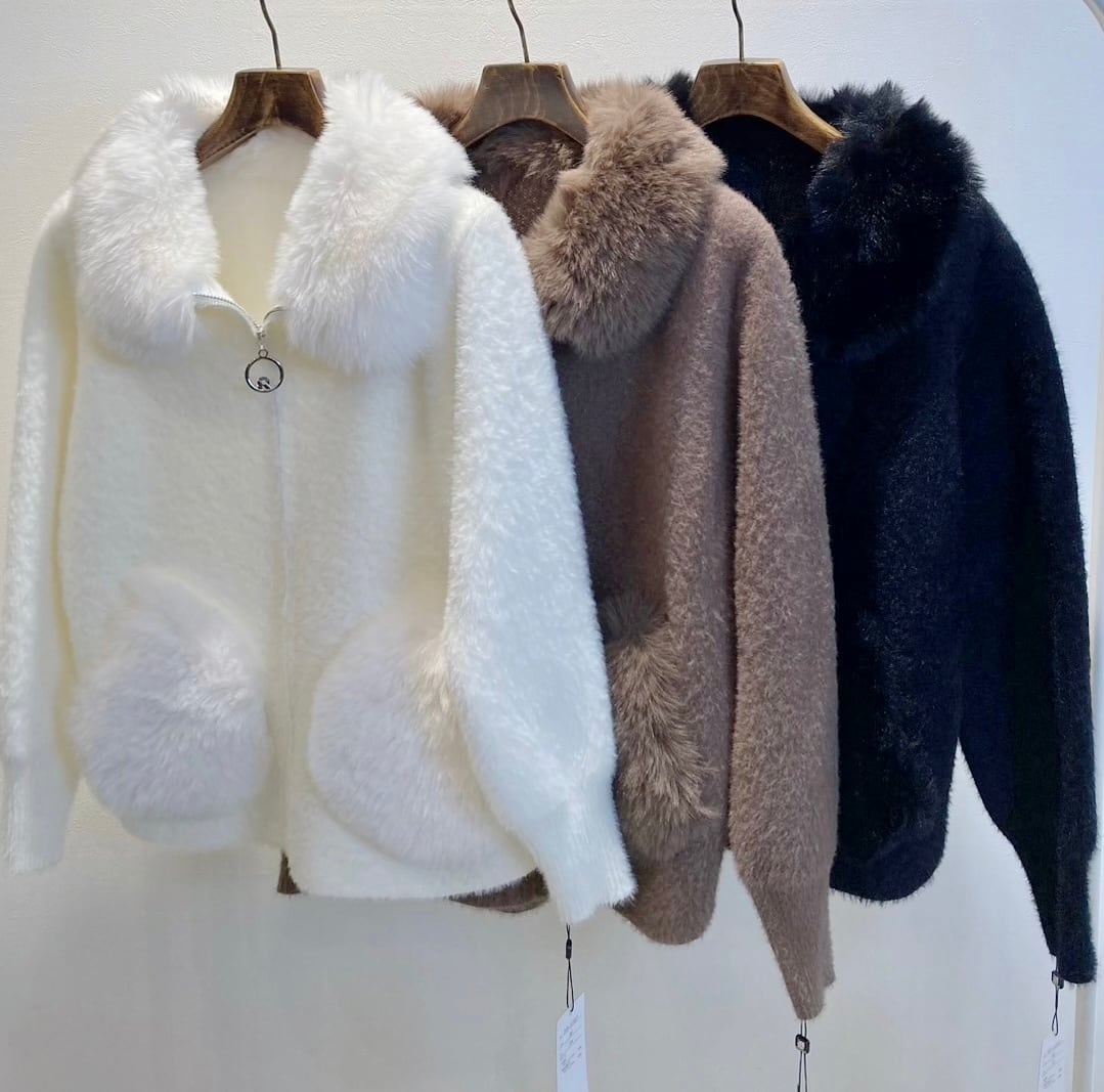 これからの季節暖かく着れてぱっと目を惹くファーシャギーニットジャケットがお色揃って再入荷!