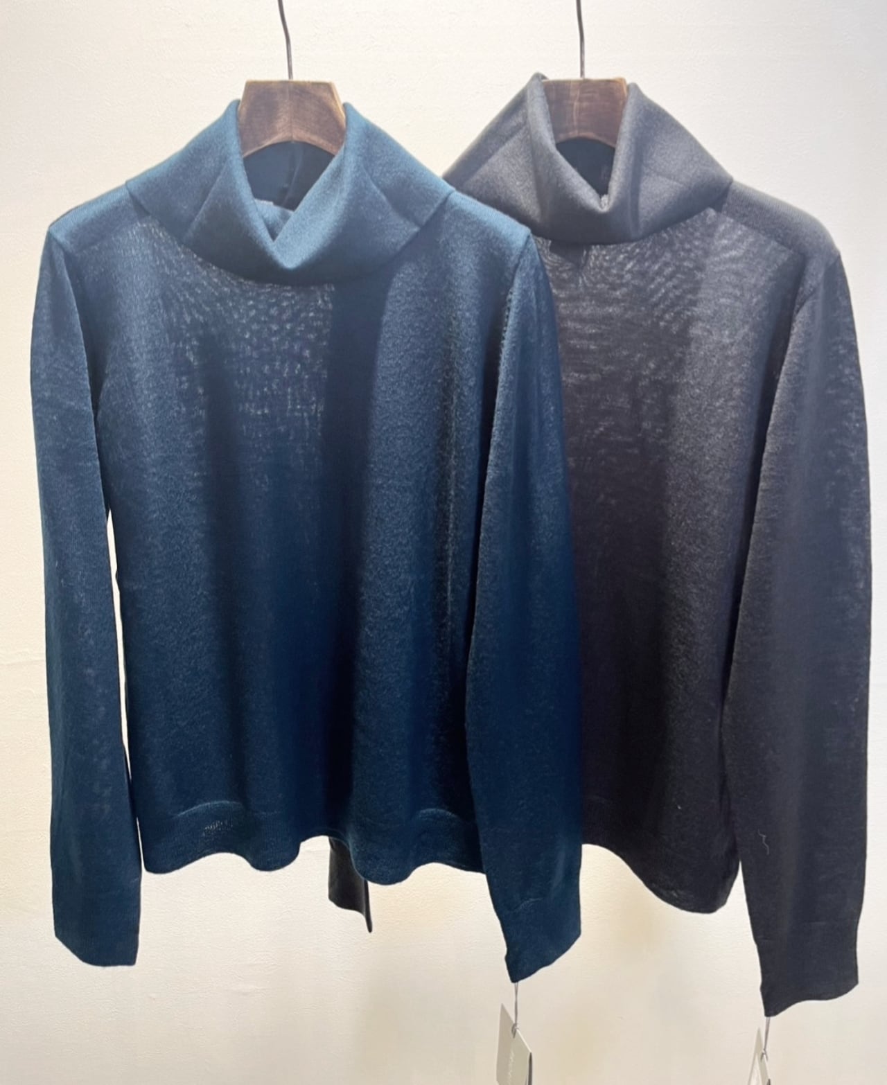 全部ボタンを留めるとタートル、開けるとオフタートルの様な着方で雰囲気が変わるデザインニット。