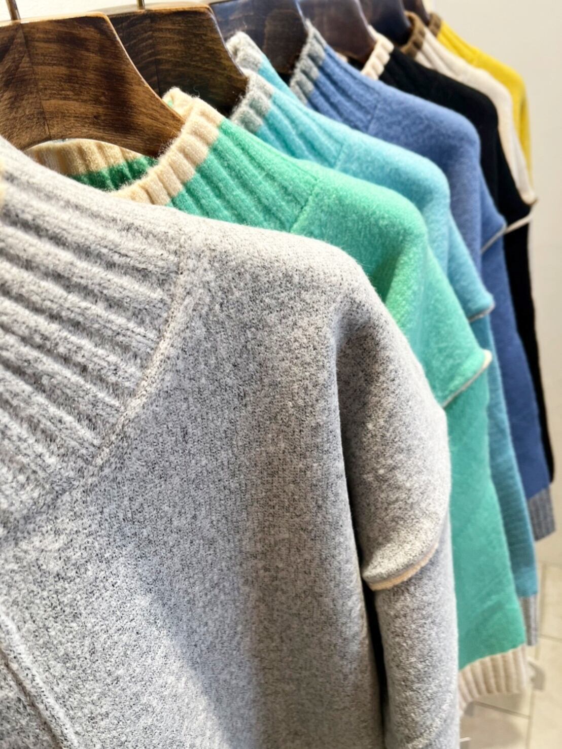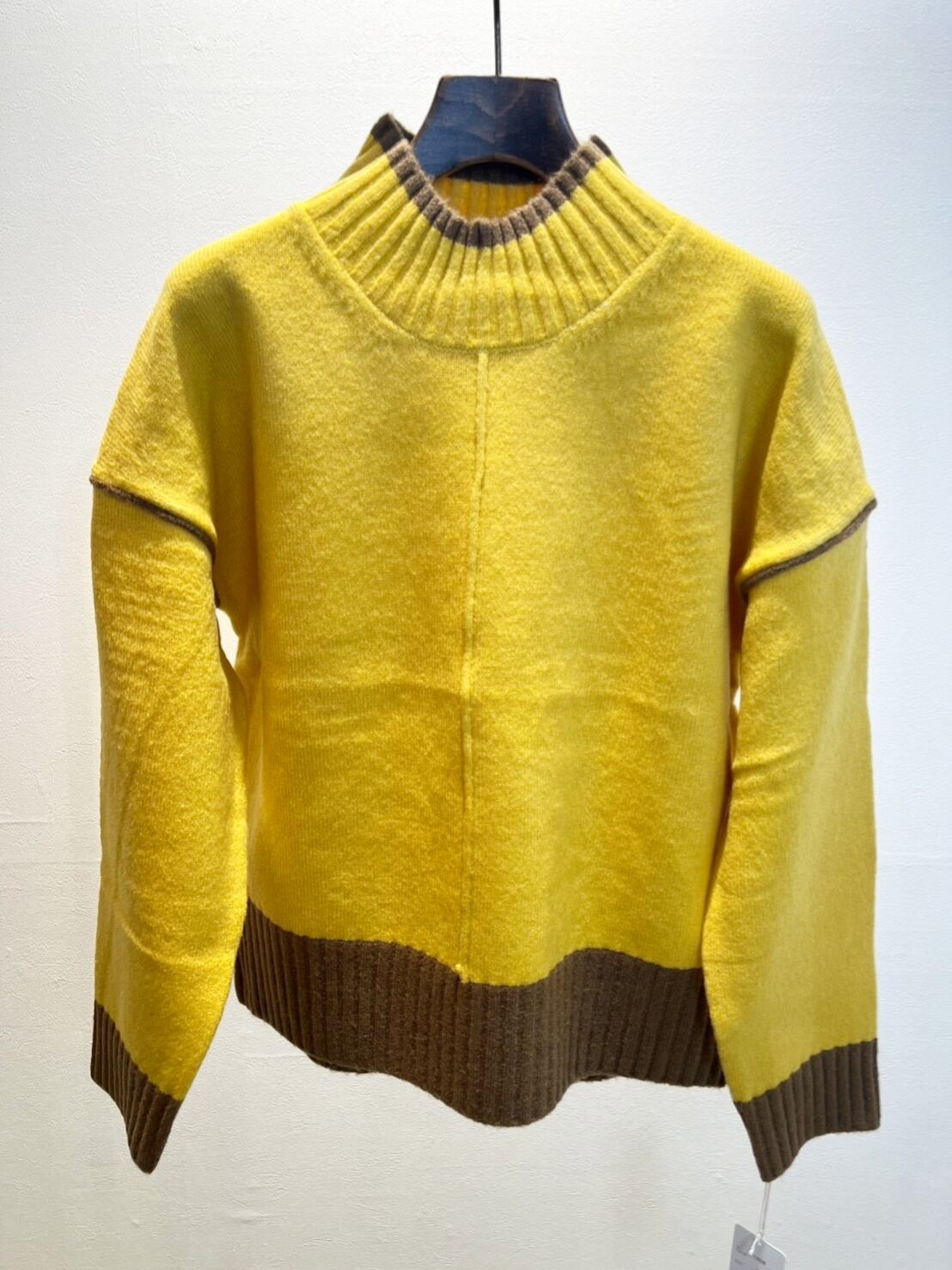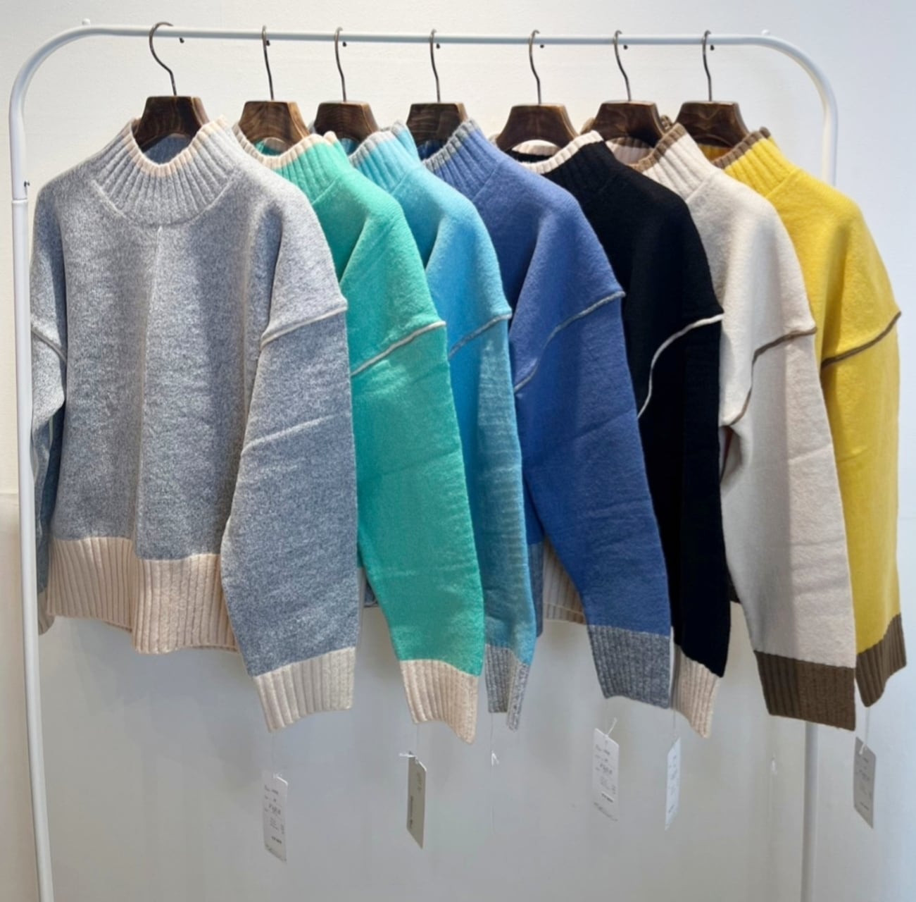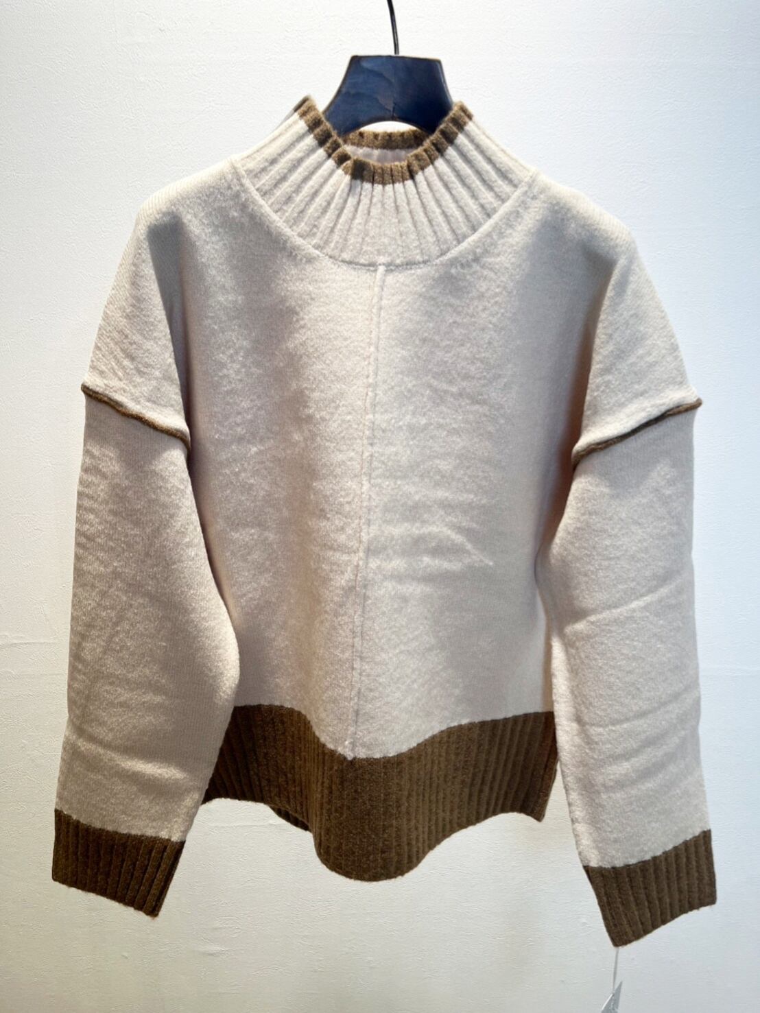 今から着れて気分が上がる春カラーのボトルネック配色ニットトップス!