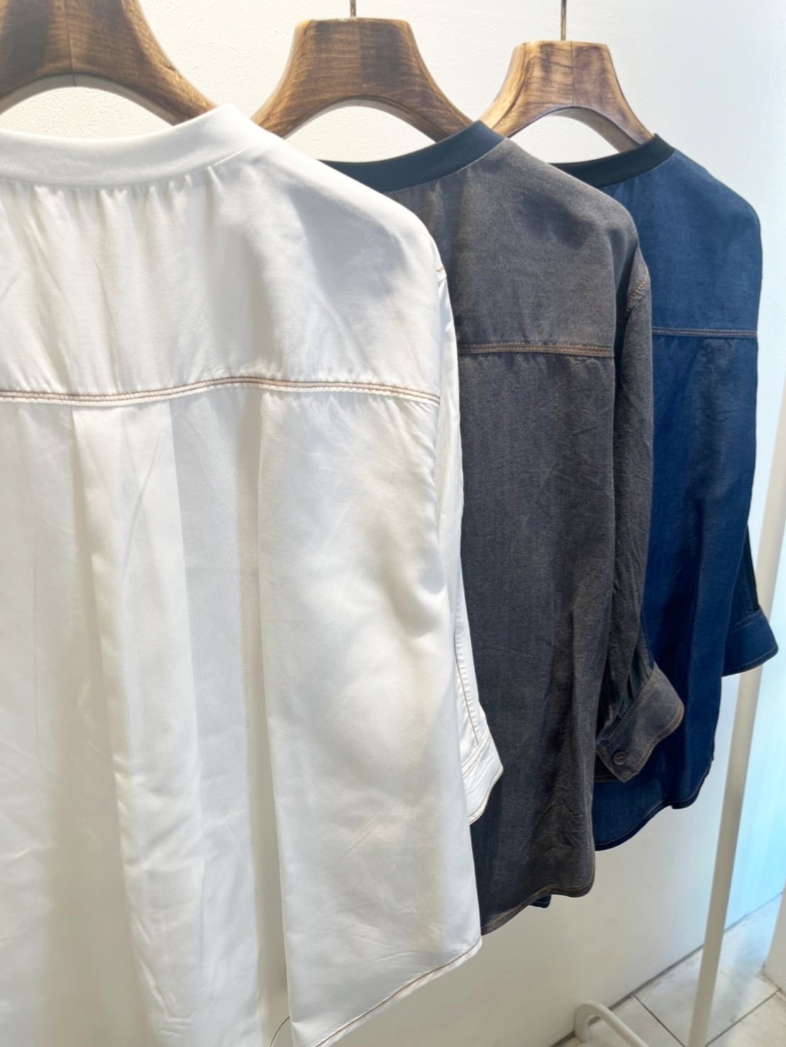 カット素材とブラウス素材を掛け合わせた1枚着るだけでレイヤードスタイルを叶えてくれるデザイントップス。