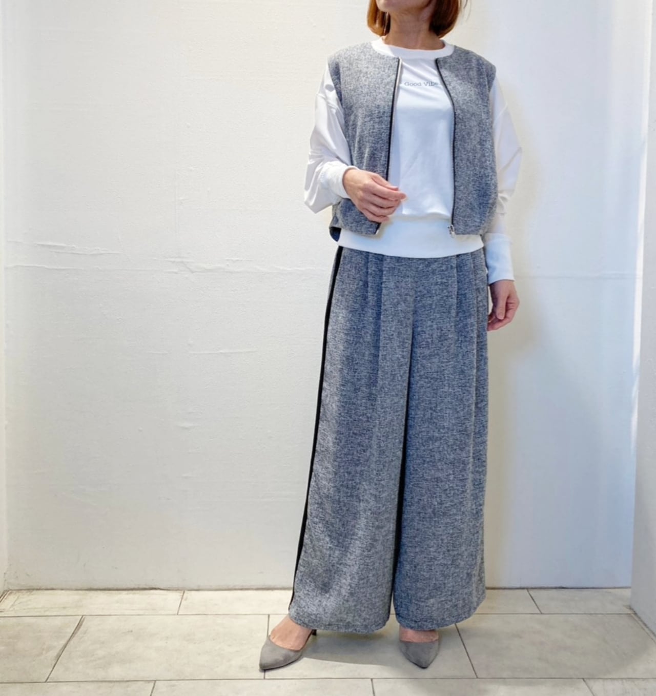 セットアップにもなるベストもあり大人綺麗な1着です。