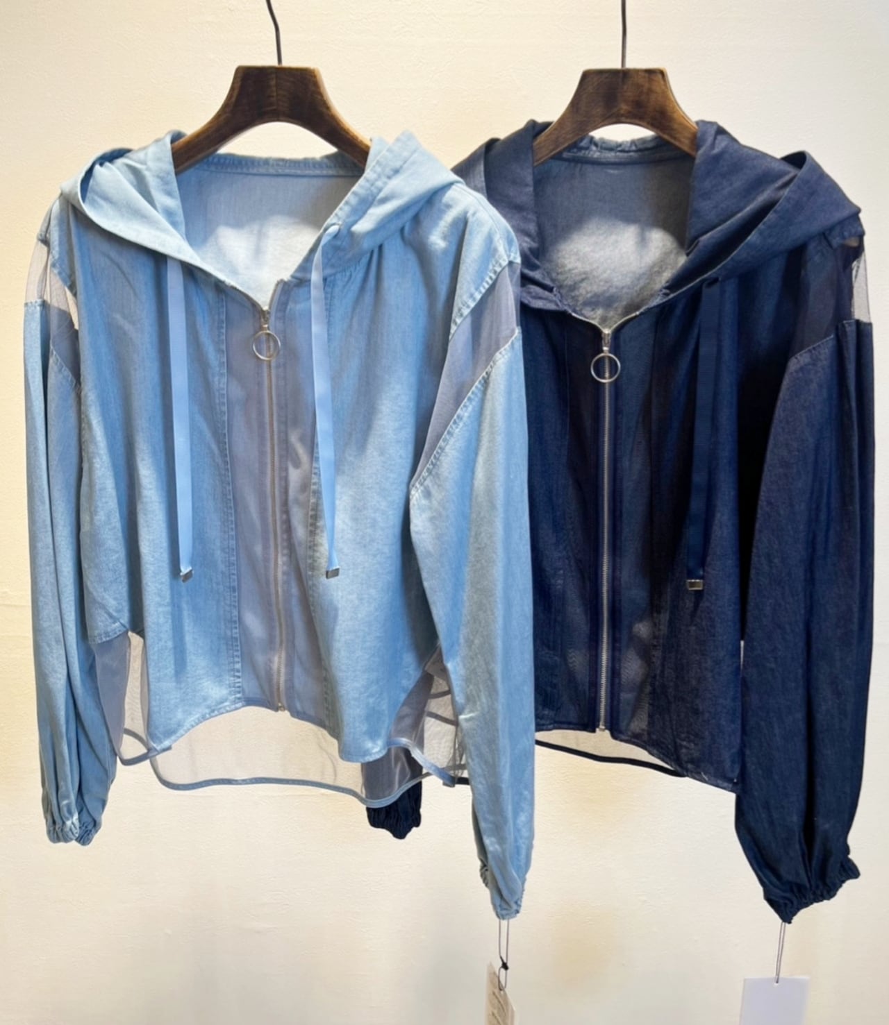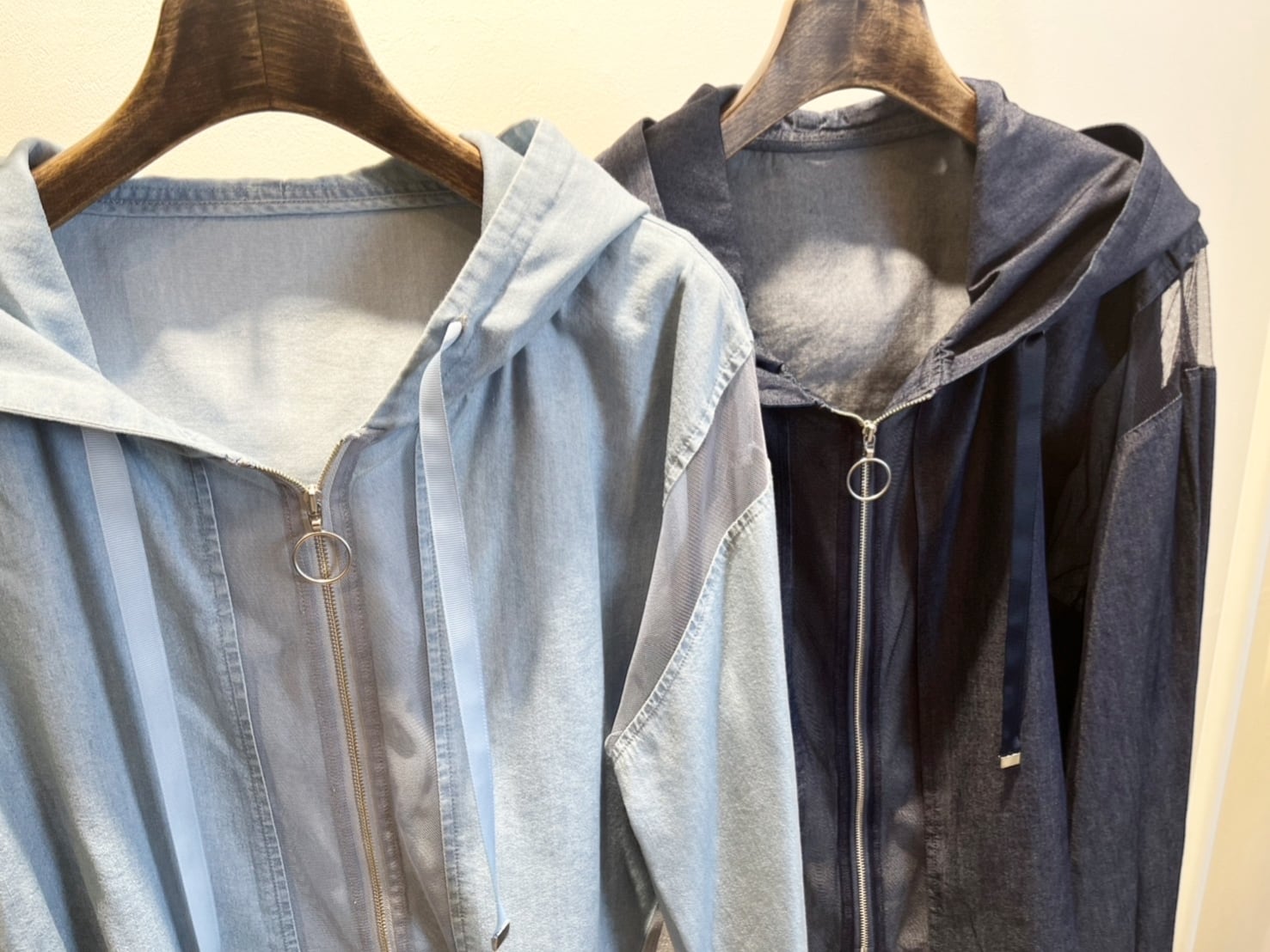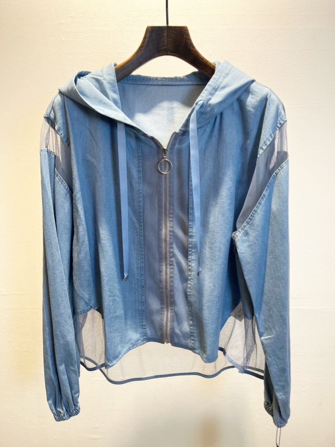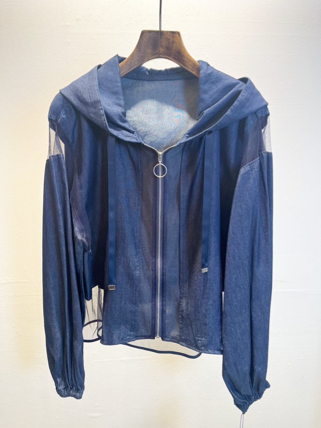 シアーメッシュ切替で涼しげな薄手デニム生地のパーカージャケットは春夏晩夏まで長く着て頂ける羽織です。