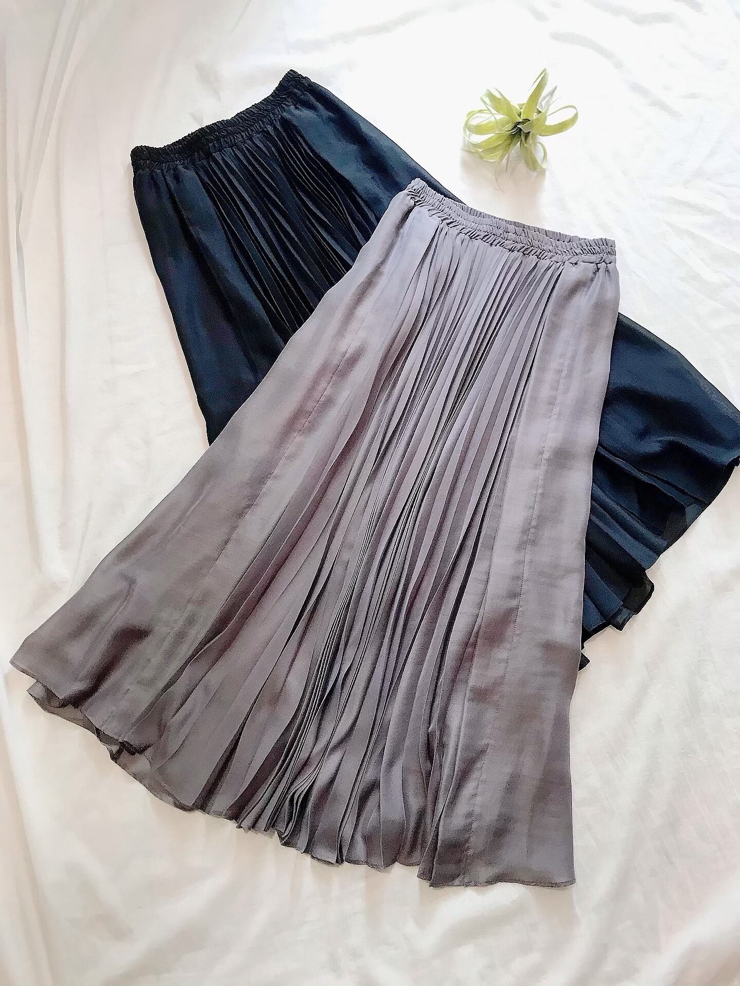 少し光沢感のあるシアー生地がとっても綺麗なプリーツ切替シアーロングスカート