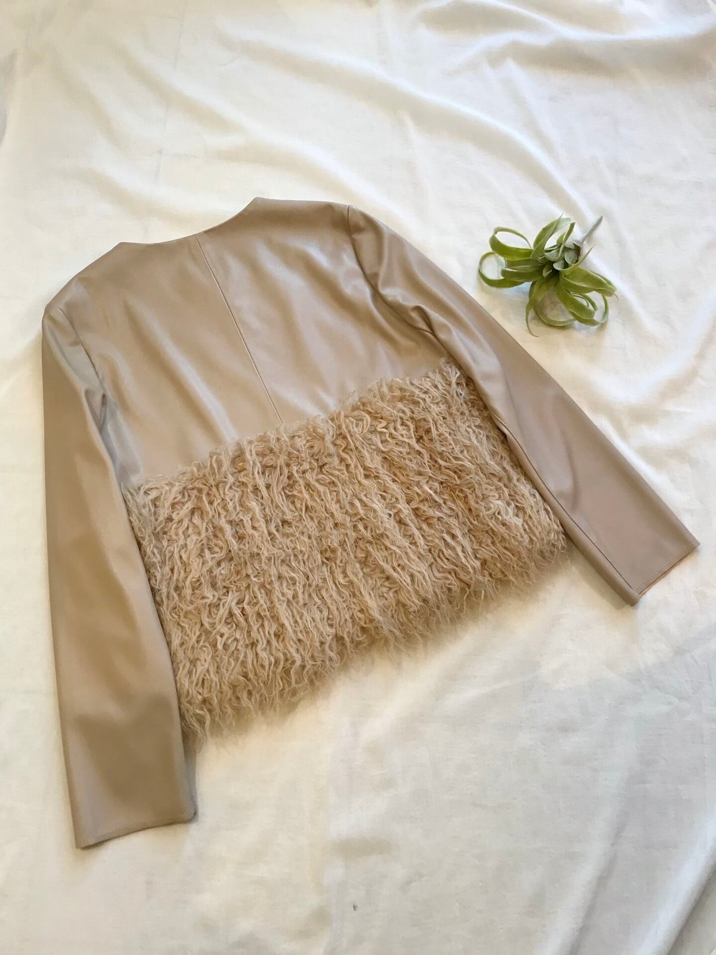 レザーにファーがデザインされたカッコ可愛いフェイクレザージャケットです。