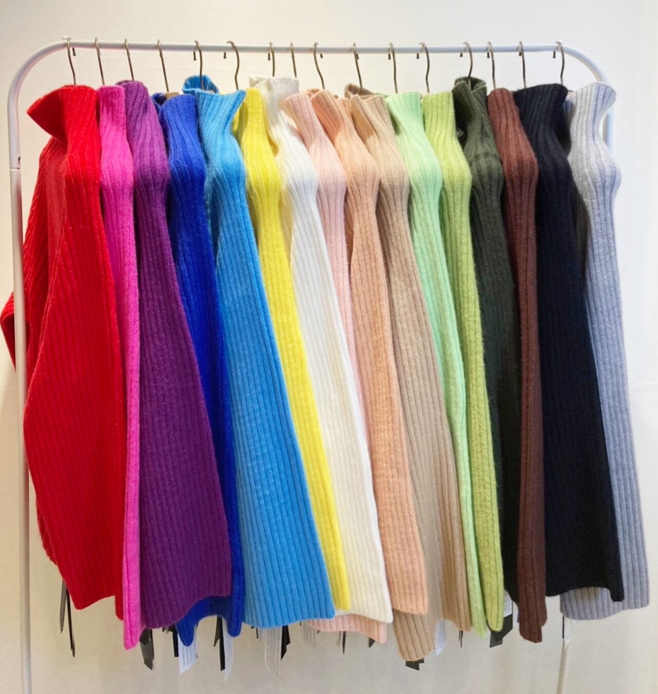 毎年大人気な定番のスカートにもパンツにもバランスよく合わせて頂ける綺麗なカラーバリエーションが豊富で何色あっても使えるおすすめリブニットです。