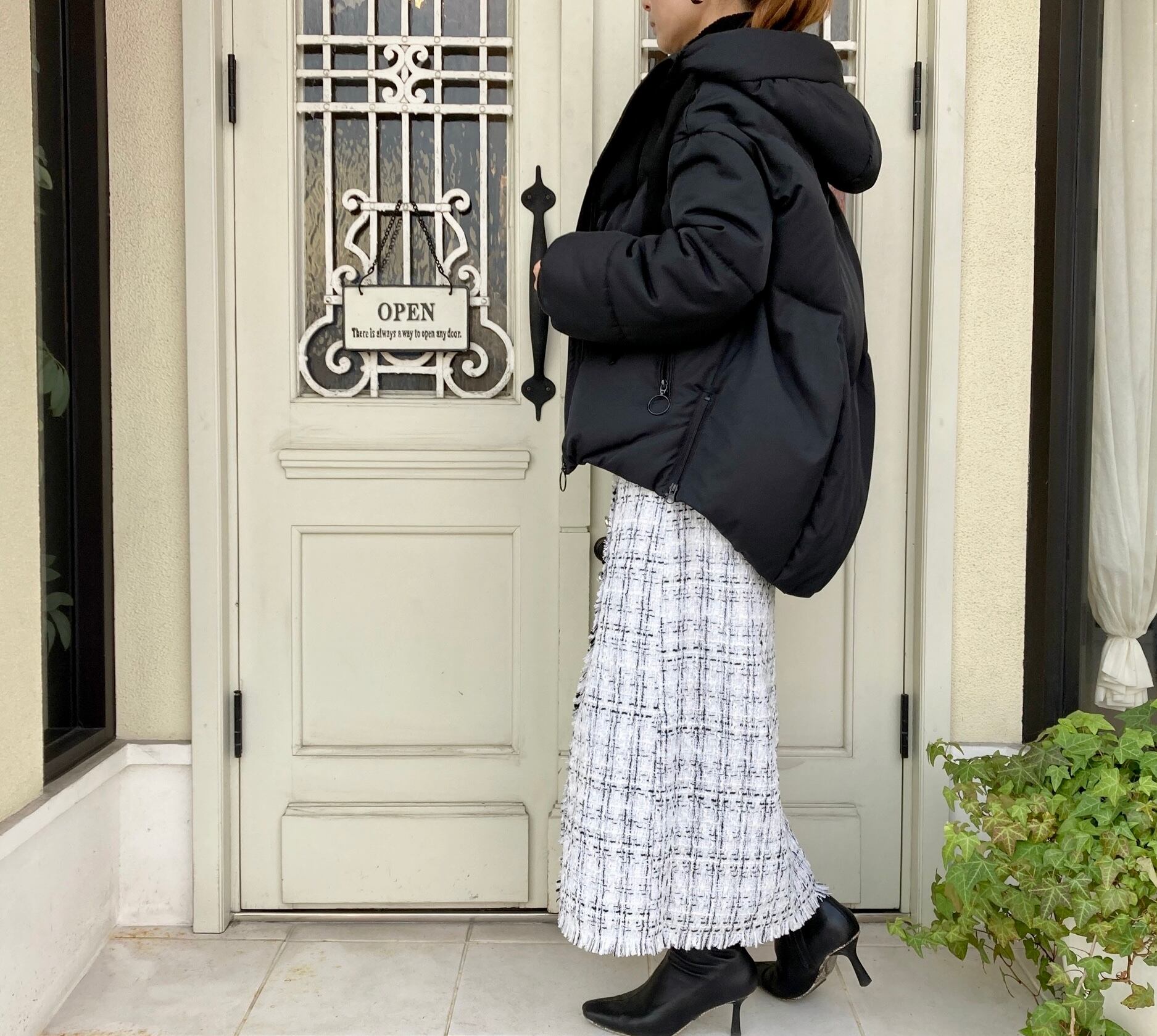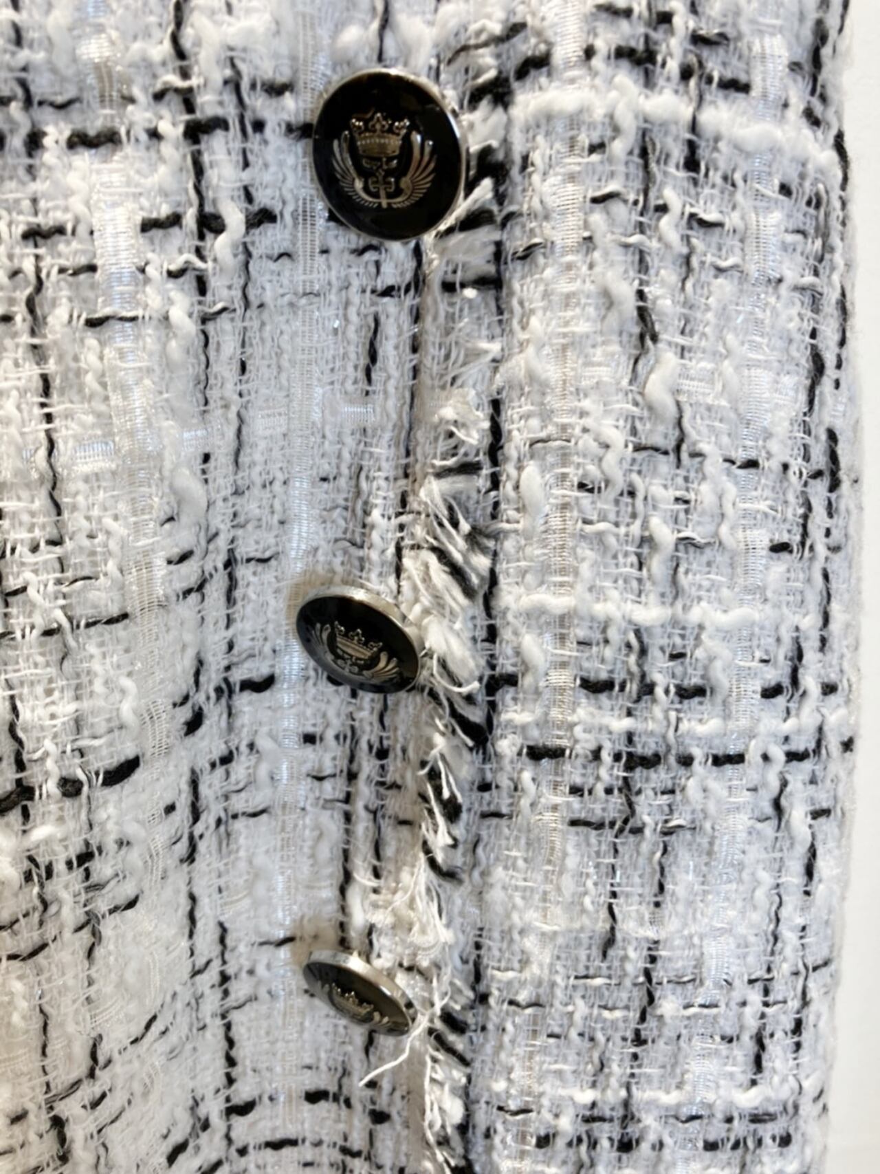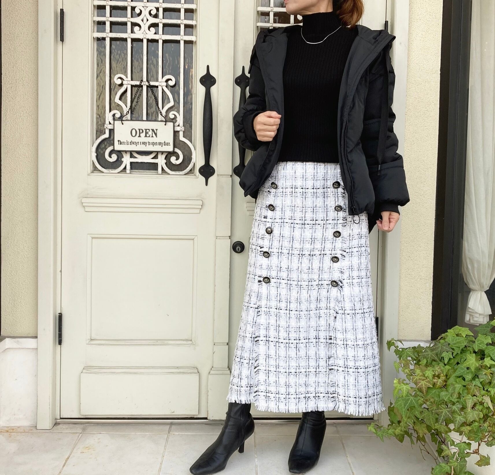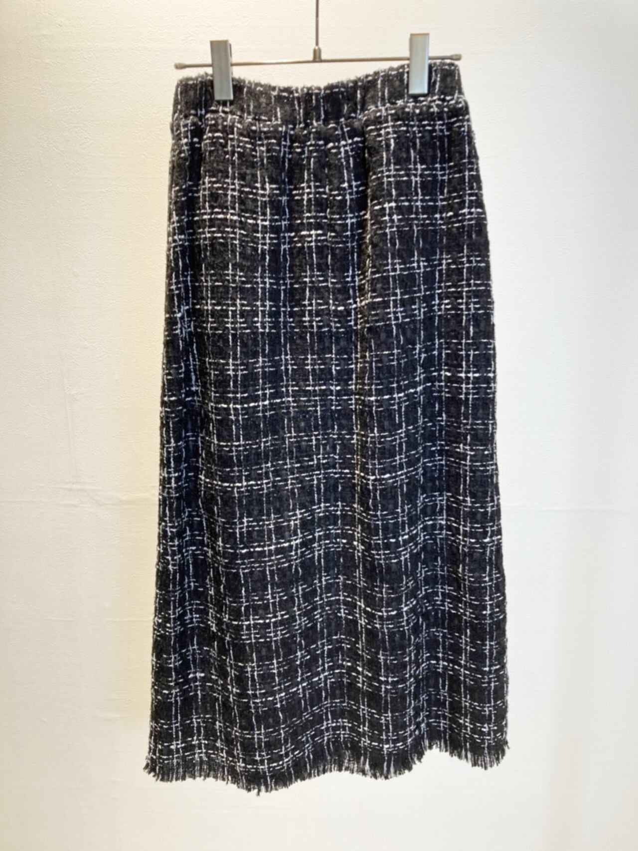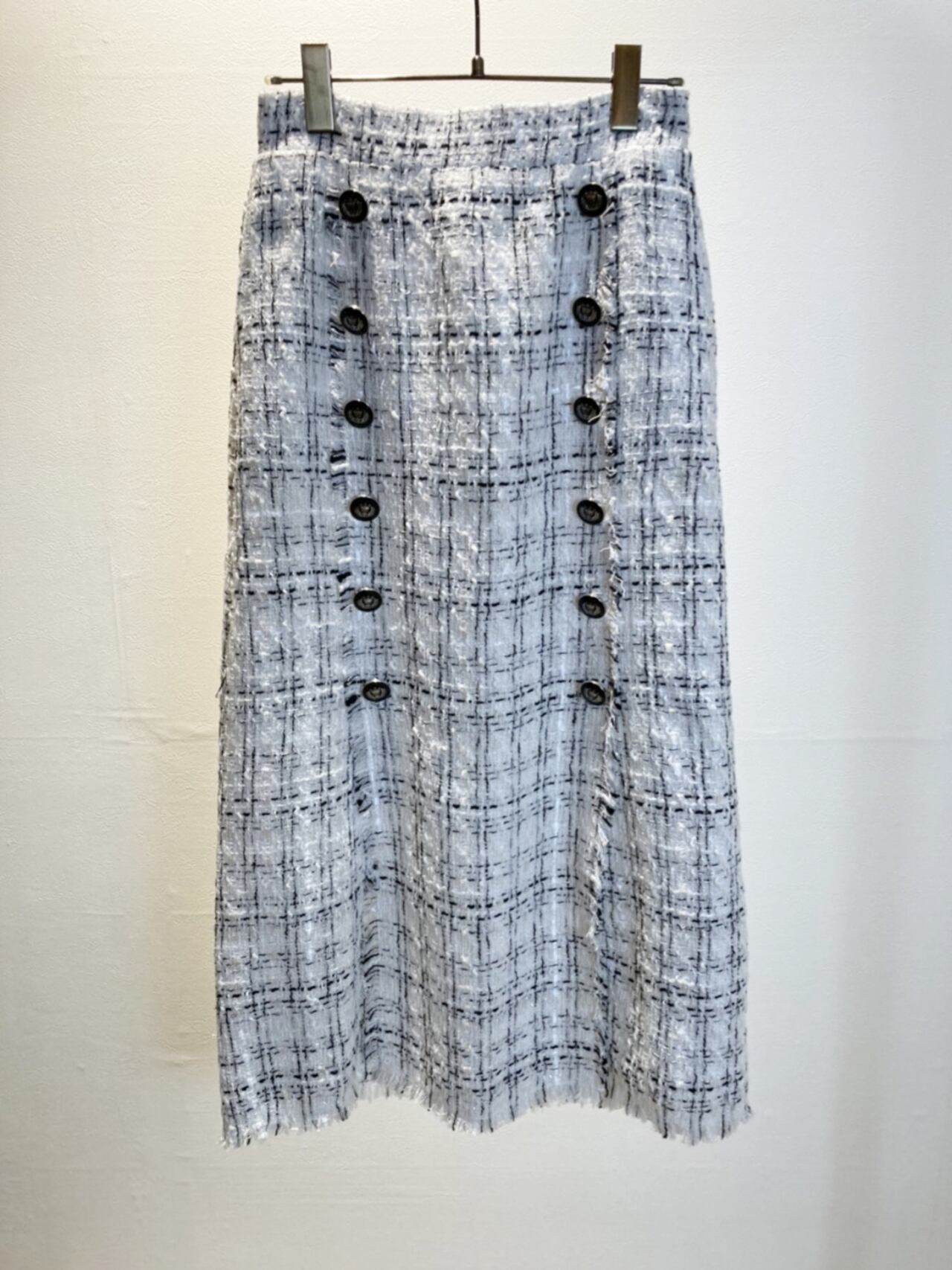 ほんのりラメ糸が編み込まれたボタンデザインがアクセントになったツイード生地のミリタリースカート。