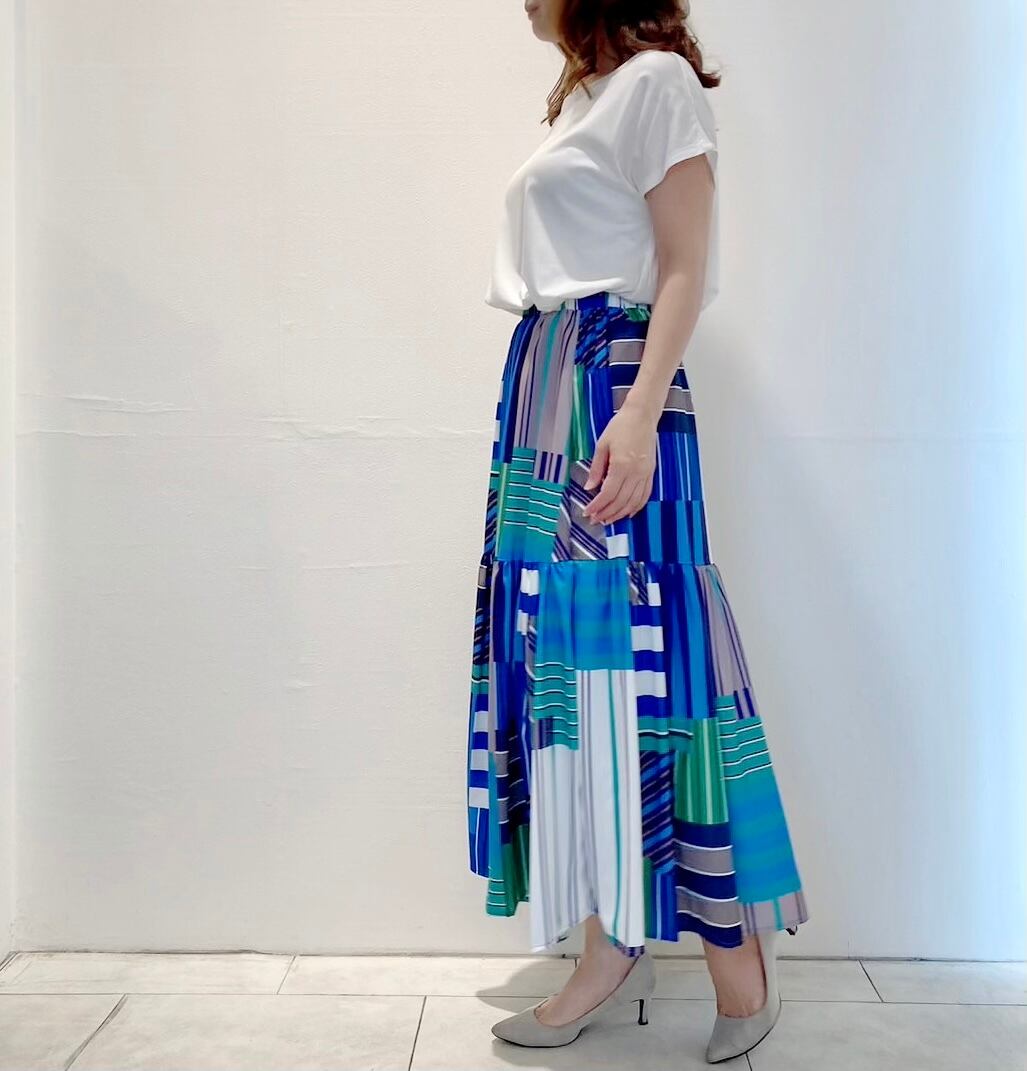 ランダムなストライプ柄がパッチワークされたとろみスカート